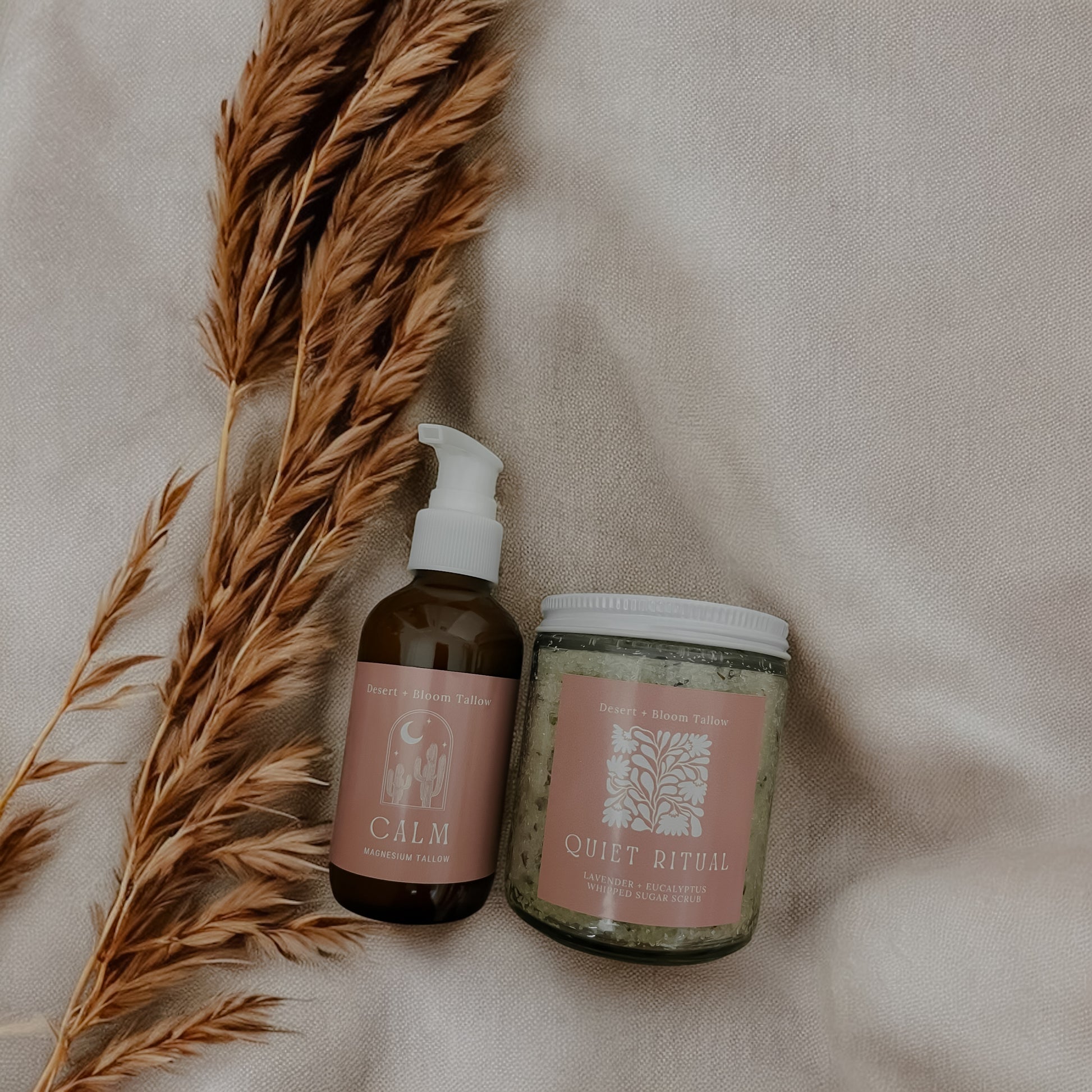A soothing duo designed to relax the body, calm the mind, and nourish the skin. The Quiet Ritual Sugar Scrub gently exfoliates with tallow, eucalyptus, and lavender oils—buffing away impurities while deeply hydrating and promoting skin renewal. Follow with our Calm Magnesium Lotion, a grounding blend of grass-fed tallow, magnesium, and calming essential oils that eases tension, soothes inflammation, and supports restful sleep. The perfect ritual for restoration, relaxation, and radiant skin.