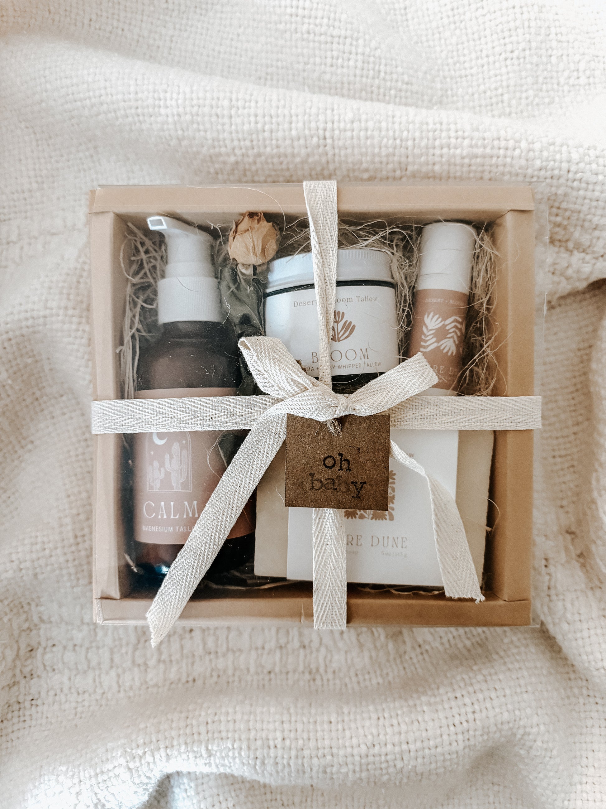 4 oz Calm Magnesium Lotion | 2oz Bloom Lotion | 5 oz Bare Dune Tallow Soap | 0.4oz Lip Balm