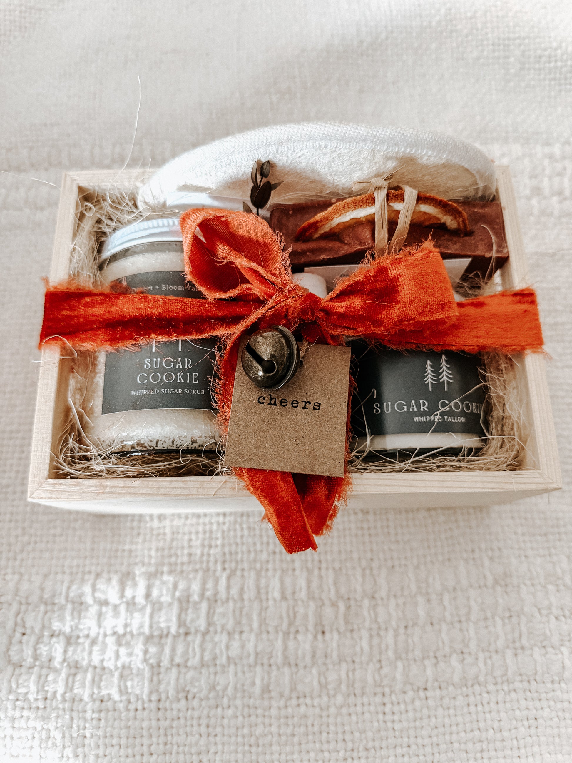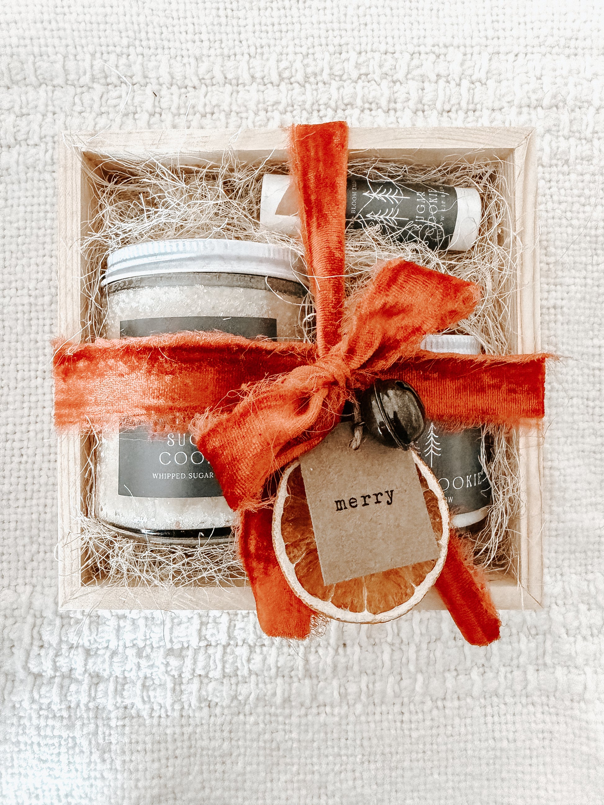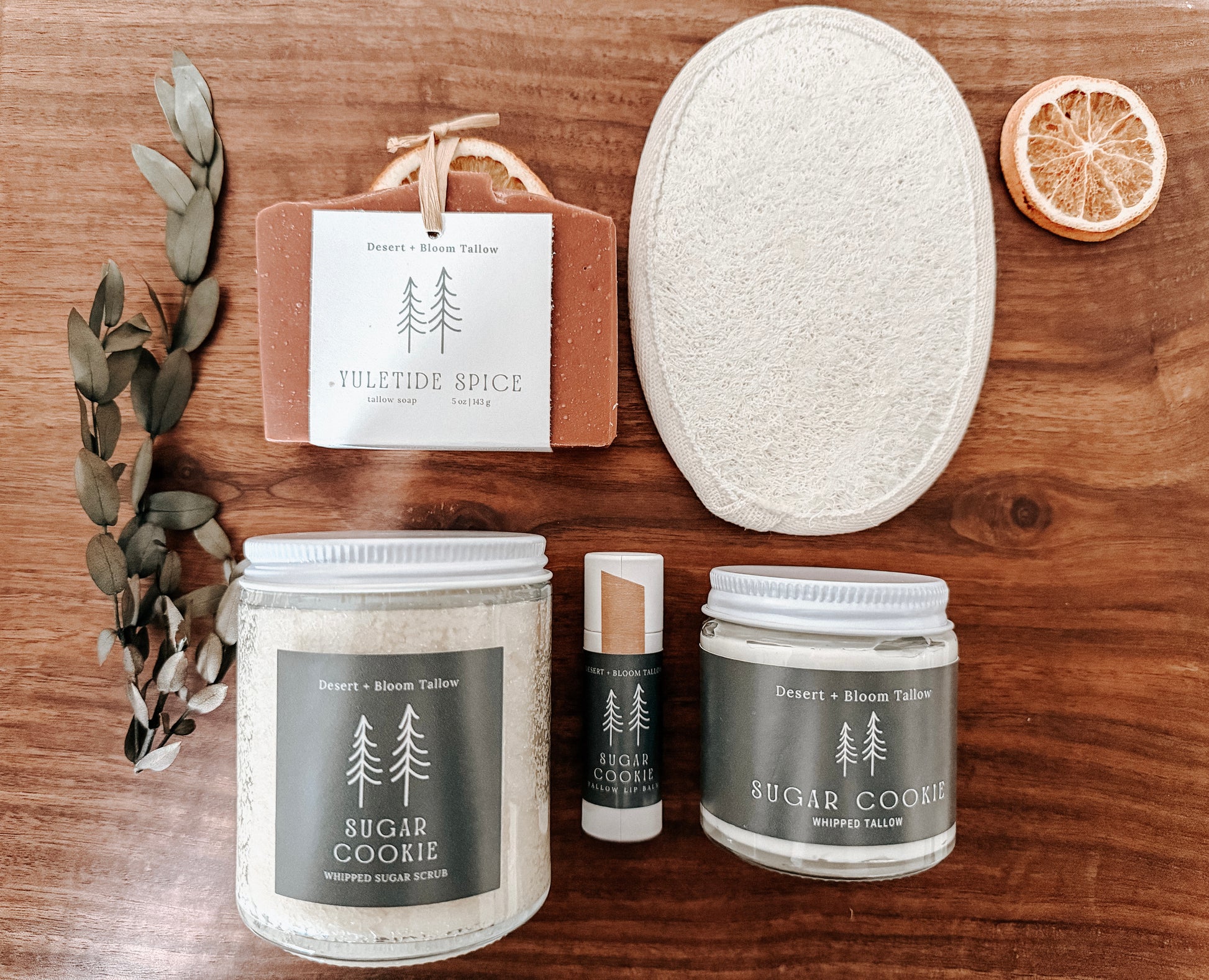 Whipped Tallow Lotion • Whipped Tallow Sugar Scrub • Sugar Cookie Lip Balm • Yuletide Spice Tallow Soap Bar • Natural Loofah Pad